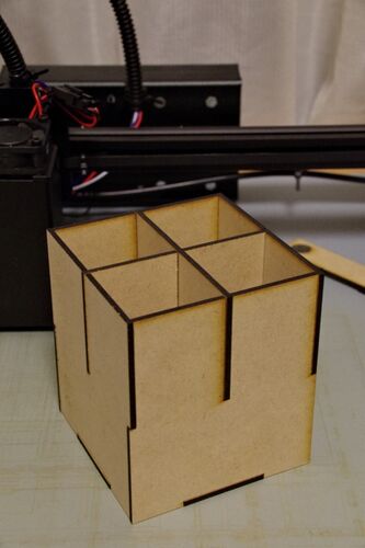 三段ペン立て 思ったより出来が良くてびっくりレーザーカッターの調整が終わったので、三段ペン立てを作ってみました。前回の切れない問題ですが、MDF板の四隅にネオジム磁石を置いて反りを抑えて、光源の高さをしっかり調節して(付属の調整用アクリル板よ…